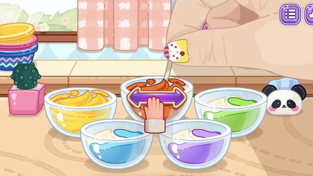 Rainbow Tiny Baker 通过直观的屏幕提示带你完成每个制作阶段。首先进行面糊混合:选择食材,搅拌至颜色和质地合适;然后将面糊稳稳倒入迷你模具,烘焙至完成;最后进入最令人期待的装饰环节,为蛋糕涂抹奶油、撒上糖霜和配料。