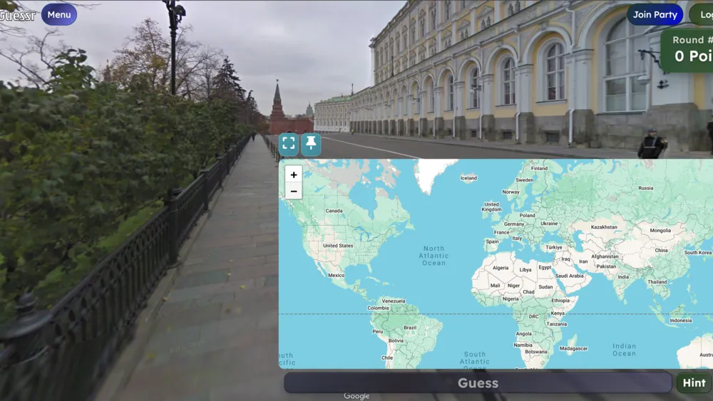在 WorldGuessr 里,街景全景图占满屏幕,你可以点击并拖动来四处环顾。屏幕角落有一张缩略世界地图——在回合计时结束前点击地图放置你的地理猜测。
